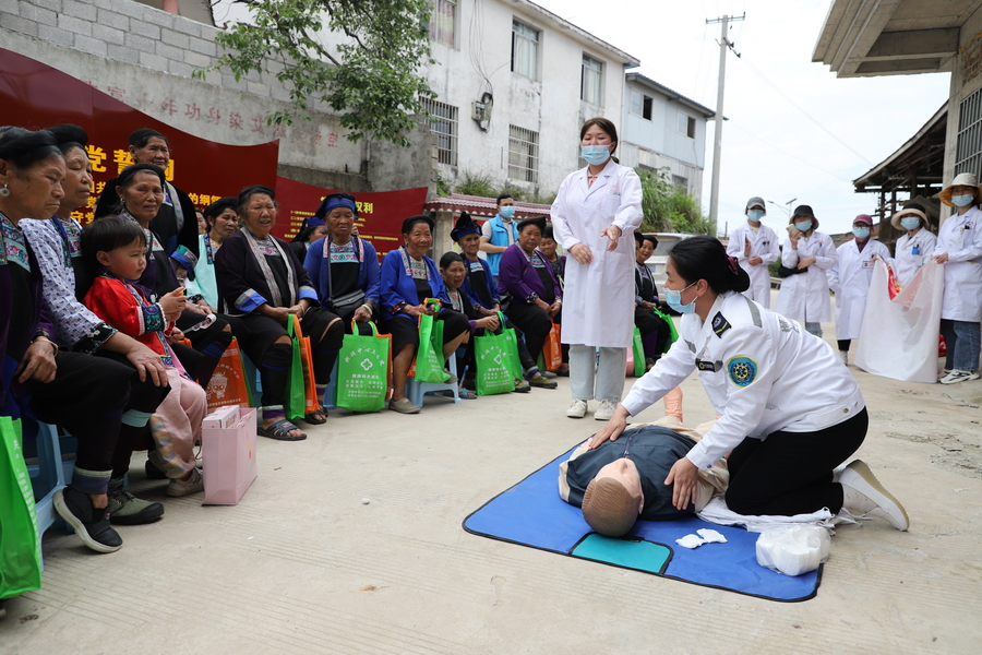 当日,还开展了文化科技卫生“三下乡”活动,志愿者向当地群众发放相关宣传资料、提供法律咨询、健康义诊、急救知识培训、苗族刺绣非遗技艺培训等。