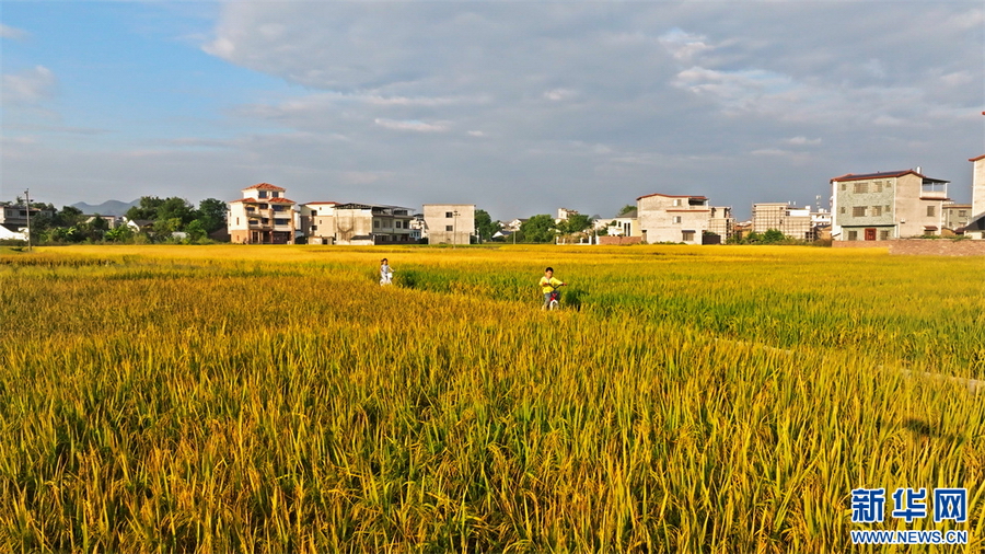 孩童在金色的稻浪中嬉戏。梁永健摄