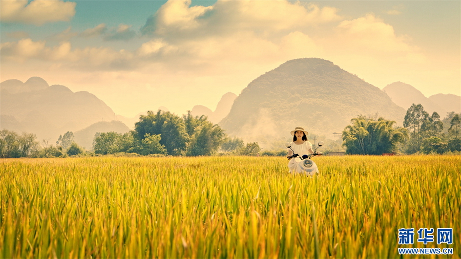 少女骑行在金秋的稻田里,周围美景将其包围。梁永健摄
