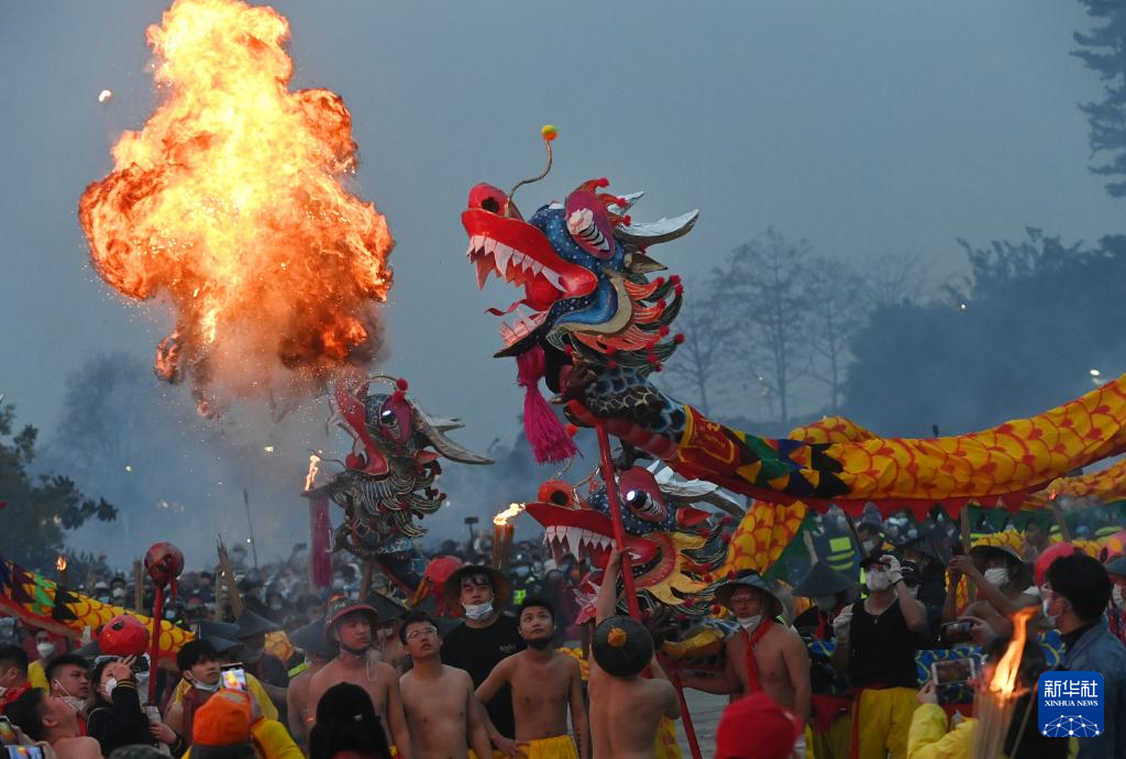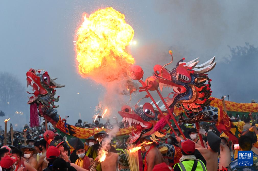 2月8日,在广西宾阳县宾州镇,“炮龙”等待起舞。