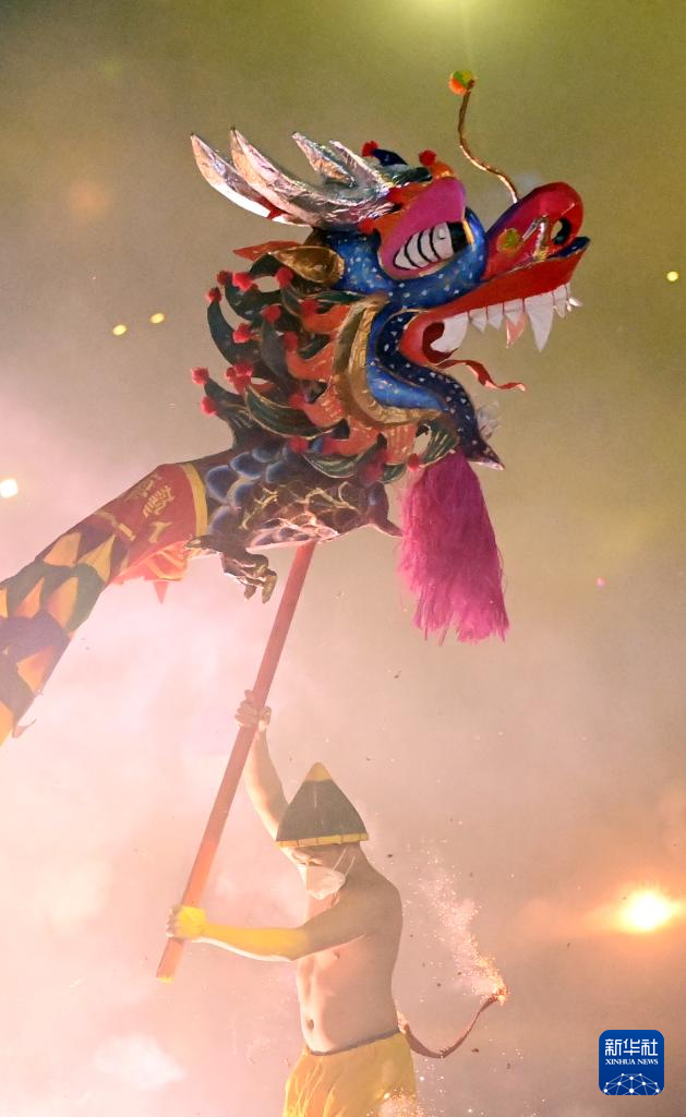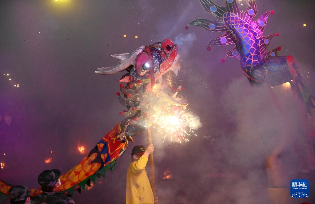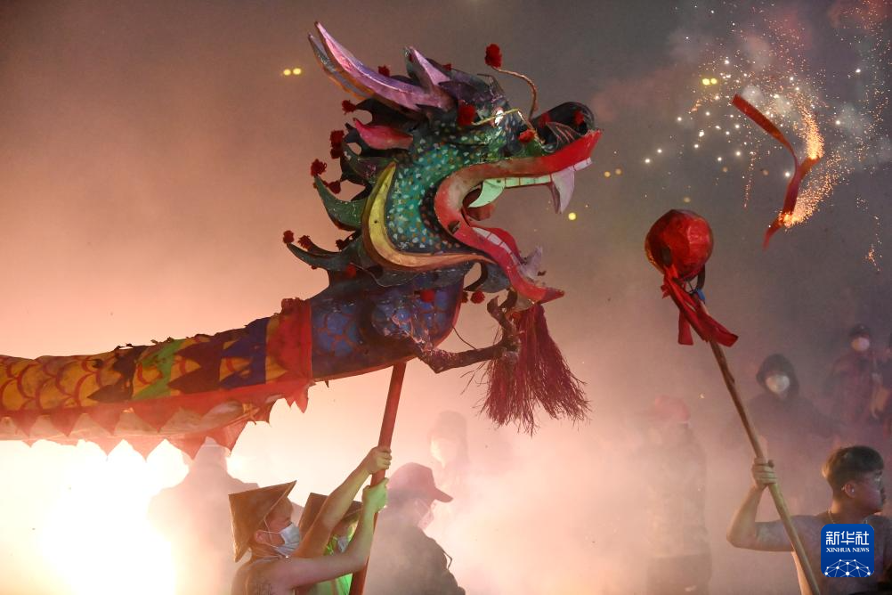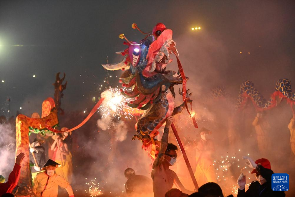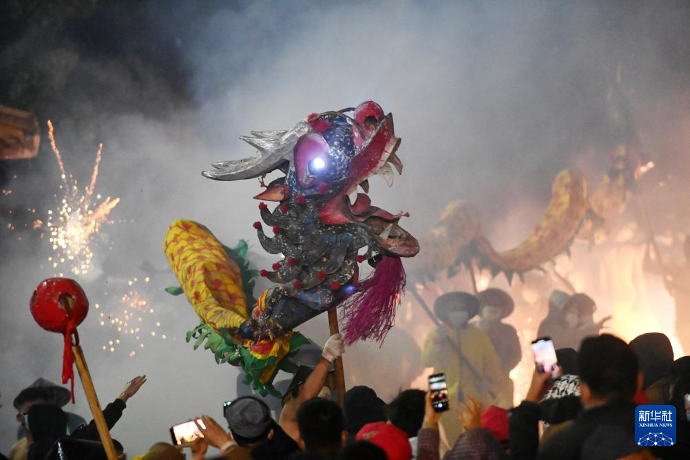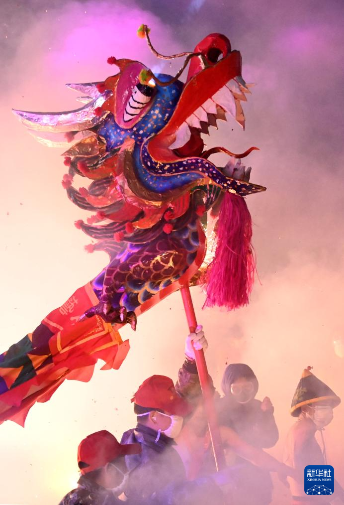 2月8日,在广西宾阳县宾州镇,人们在舞“炮龙”。