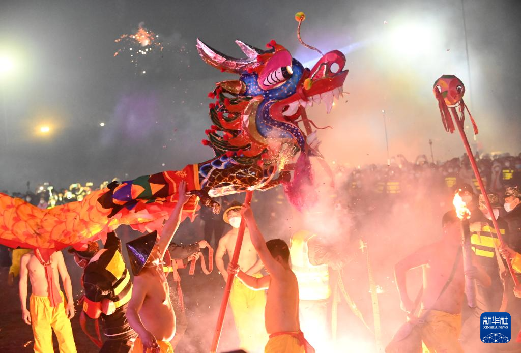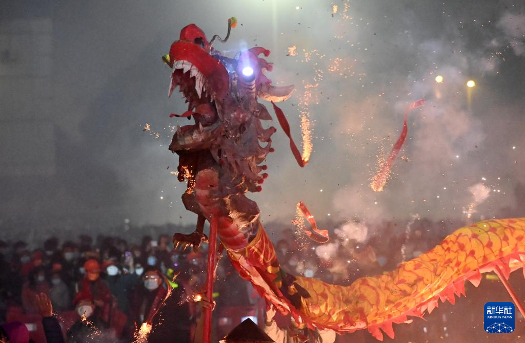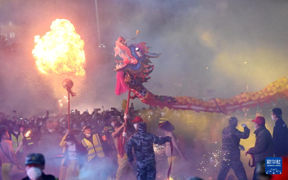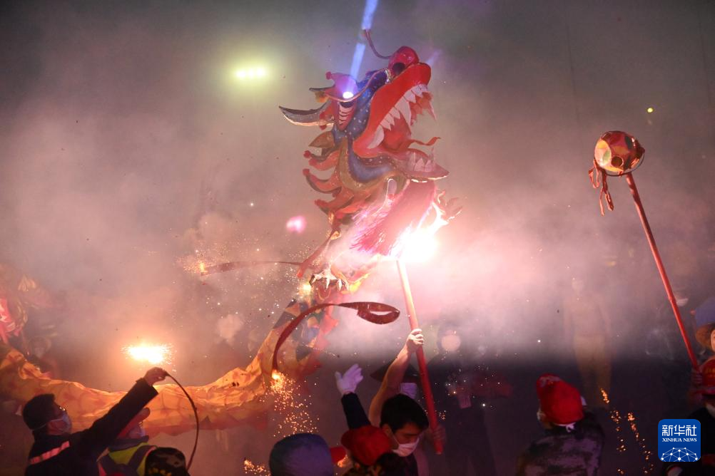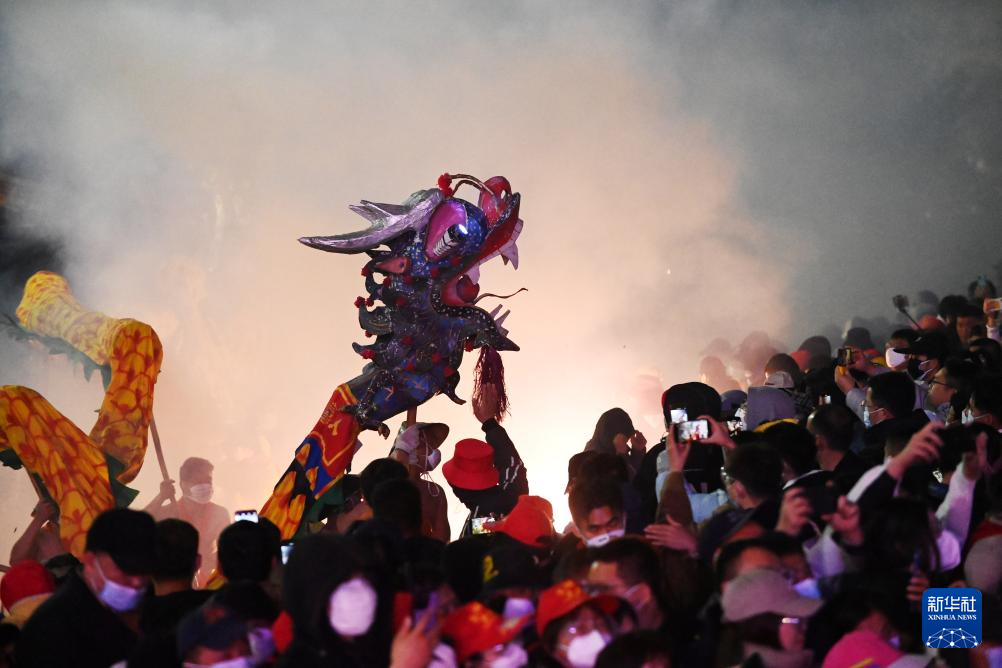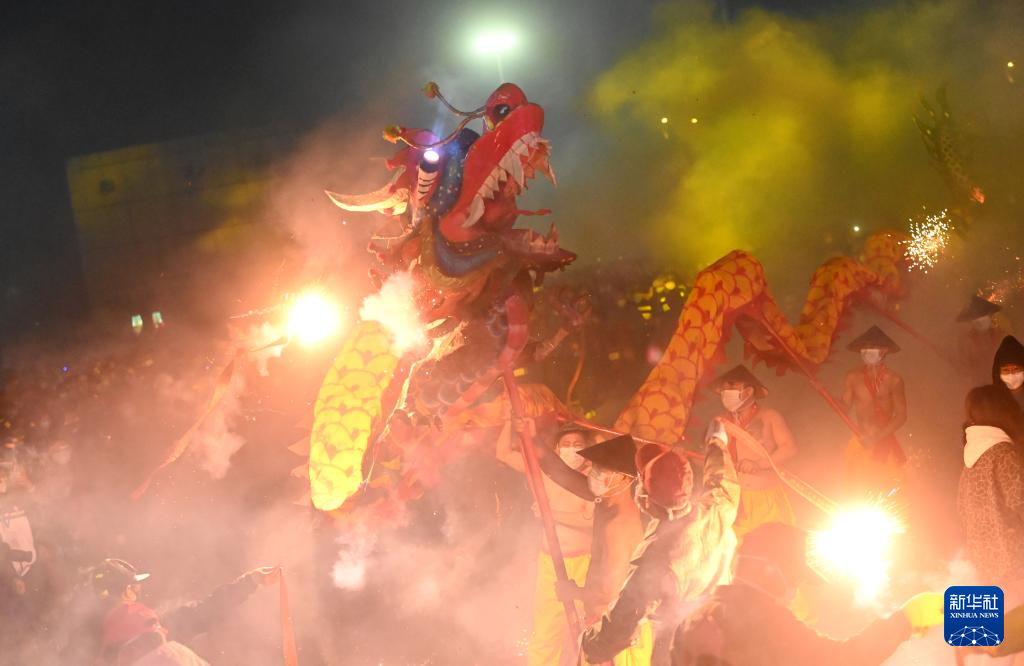 2月8日,在广西宾阳县宾州镇,人们在舞“炮龙”。