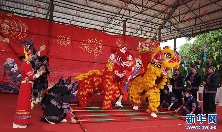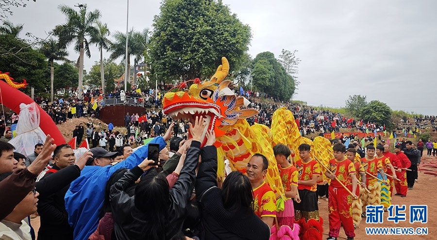 庙会上,身着壮族服饰的八音队吹响八音曲调,原生态嘹啰山歌非遗传承人唱起迎宾之歌。舞龙队穿梭于人群之中,传递着新春的祝福。那僚庙鼓、春牛舞以及狮子跳竹竿舞各类民俗表演活动轮番上演,精彩纷呈。