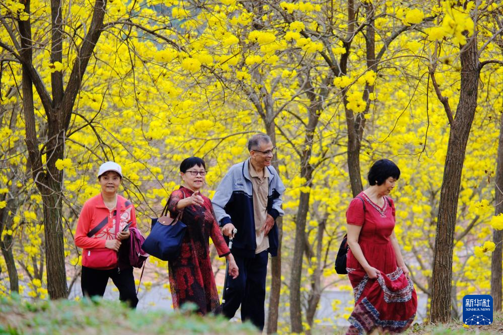 时下正是广西南宁市青秀山风景区内的黄花风铃木盛放时节,吸引了众多游客前往观赏。