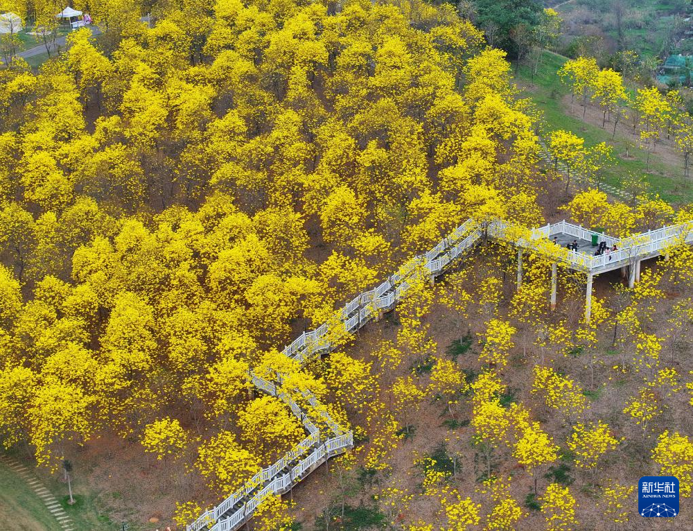 3月14日,游客在广西南宁市青秀山风景区观赏黄花风铃木(无人机照片)。 时下正是广西南宁市青秀山风景区内的黄花风铃木盛放时节,吸引了众多游客前往观赏。 3月14日,游客在广西南宁市青秀山风景区观赏黄花风铃木。 时下正是广西南宁市青秀山风景区内的黄花风铃木盛放时节,吸引了众多游客前往观赏。 3月1...