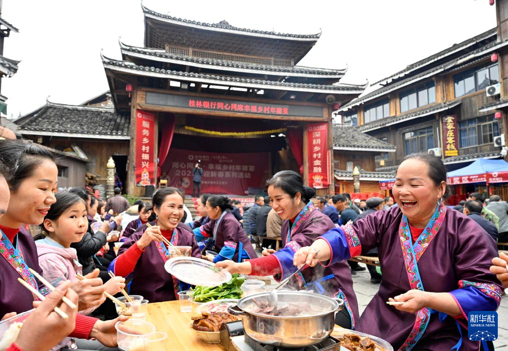 1月22日,在广西柳州市三江侗族自治县林溪镇平岩村岩寨屯,村民在岩寨鼓楼前品尝“年猪宴”。1月22日,在广西桂林市灵川县兰田瑶族乡的牌灯展演现场,一名小朋友参与互动。 蛇年春节将至,各地张灯结彩,人们参加各种喜庆活动,红红火火迎新春。...