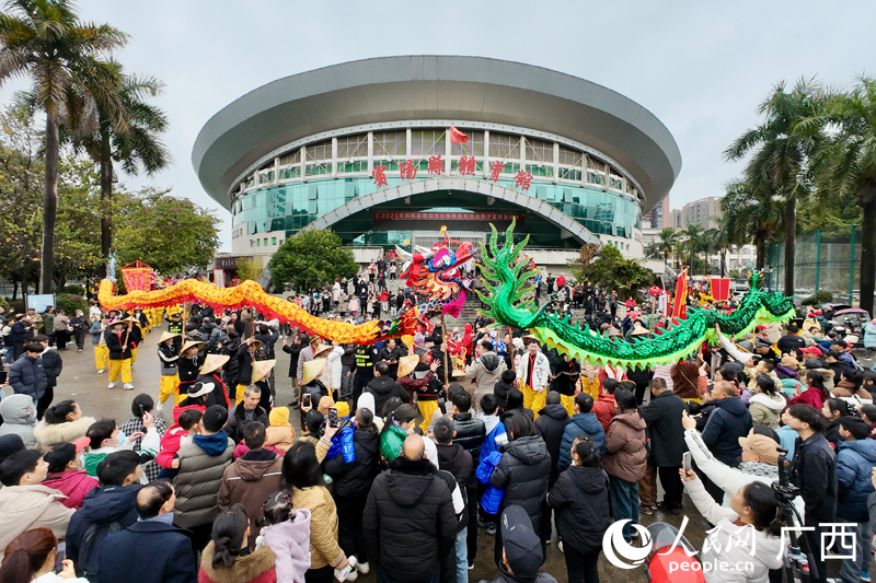 炮龙巡游。人民网 雷琦竣摄 人民网宾阳2月8日电 (雷琦竣)2月7日,宾阳炮龙节非遗巡游活动在宾阳县文化广场热闹开幕。随着一声声震天的锣鼓声,一条条色彩斑斓的炮龙在广场上翻腾起舞,引得观众阵阵欢呼。活动现场。人民网 雷琦竣摄 活动现场,火焰师手持火把,将火焰...