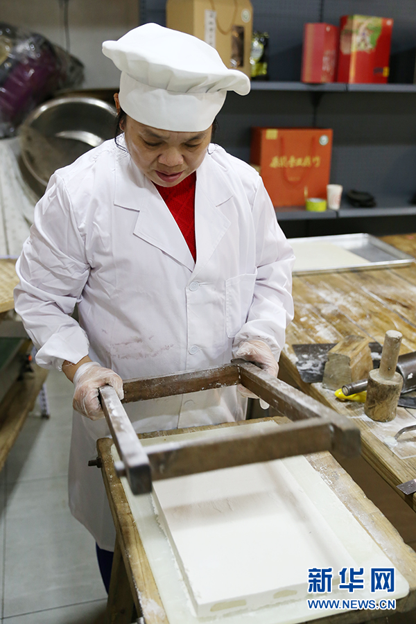 自治区级非物质文化遗产柳城云片糕制作技艺代表性传承人黄智英正在忙着制作云片糕。新华网 刘君 摄