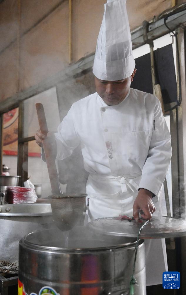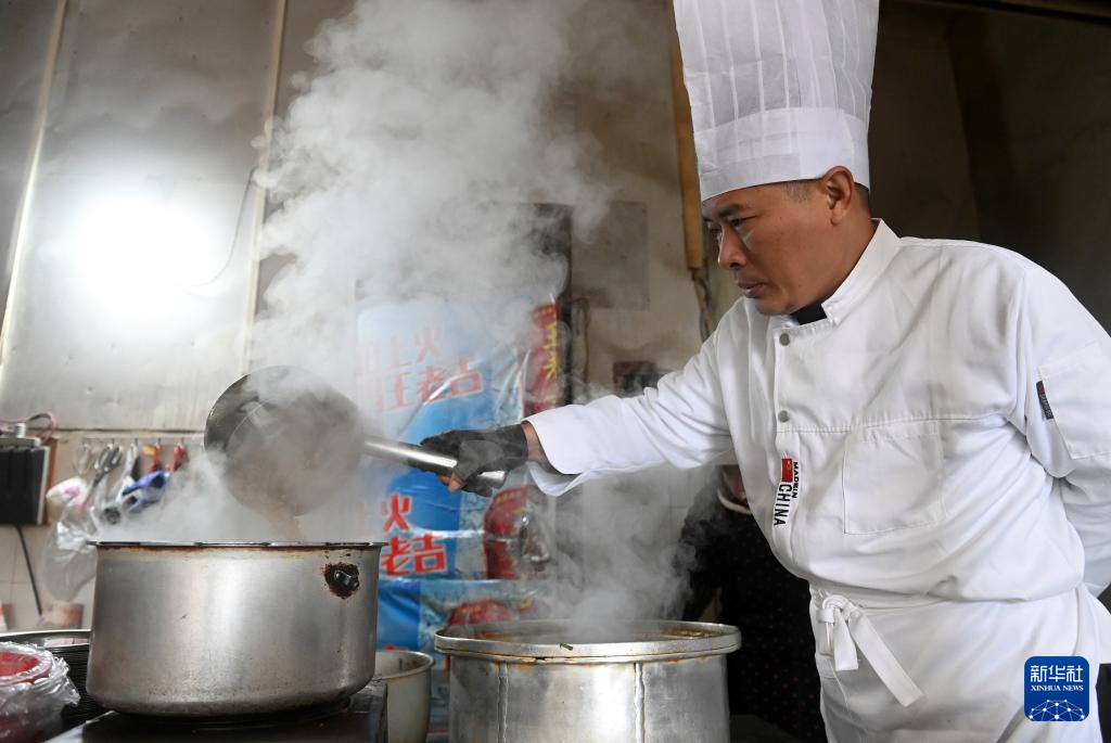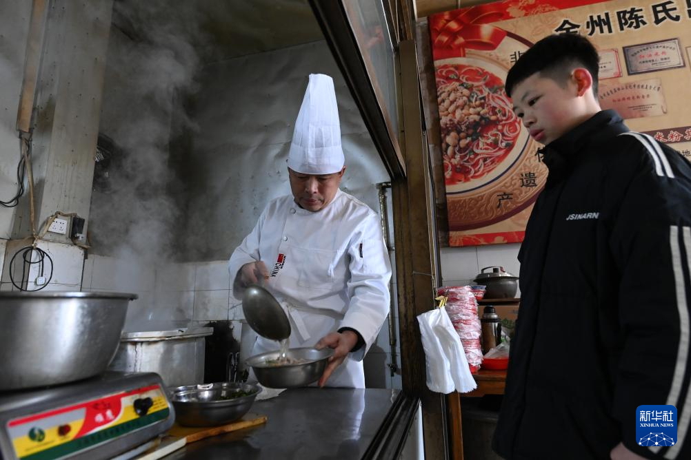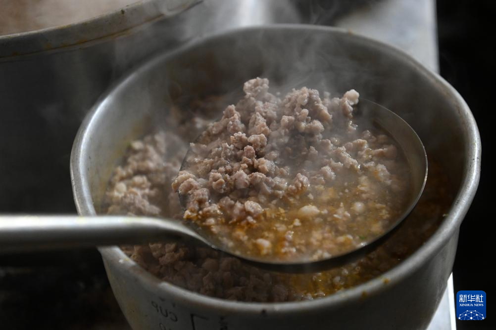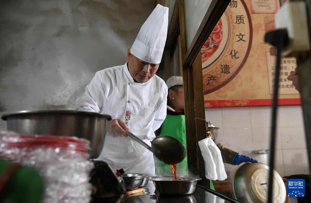 1月25日,在广西全州县全州镇,刘勇在给红油米粉加骨头黄豆汤。