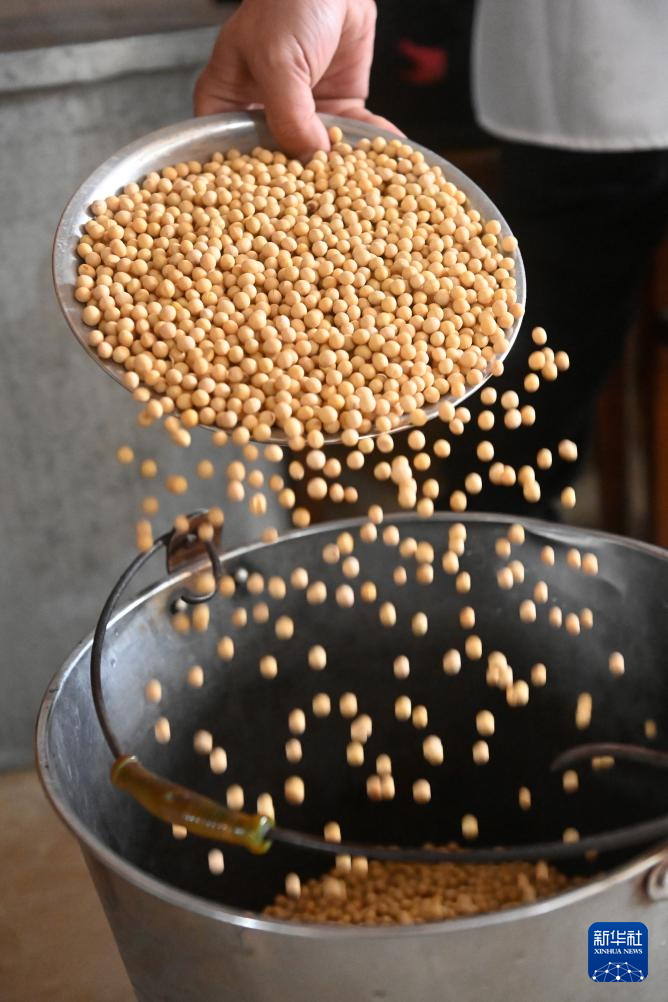 1月25日,在广西全州县全州镇,刘勇在打黄豆准备熬制红油米粉的汤料。