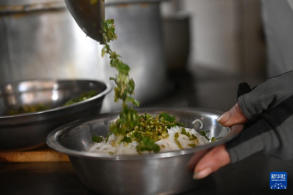 1月25日,在广西全州县全州镇,刘勇在给红油米粉加肉末。