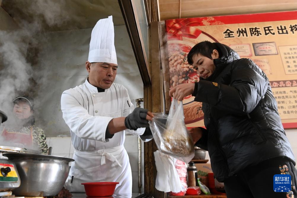 1月25日,在广西全州县全州镇,刘勇(左)在给顾客打包红油米粉。