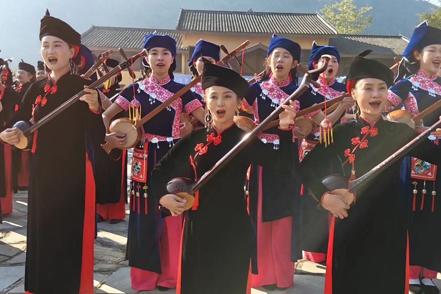 12月25日,演员在广西崇左市龙州县上龙乡新联村甫茶屯表演大型天琴弹唱。(新华网 周敏 摄) 12月25日,2023年广西崇左壮族天琴艺术周开幕式在崇左举行。国内相关专家学者汇聚一堂,为进一步研究挖掘壮族天琴文化艺术价值,保护传承文化遗产建言献策、贡献力量。12月25日,演员在广西崇左市龙州县上龙乡新联村甫茶屯表演...