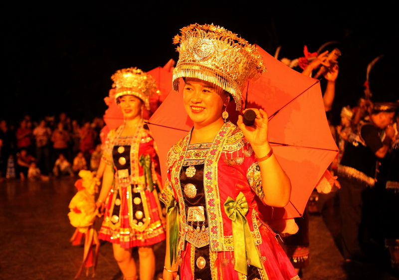 随着国内防控疫情的好转,旅游业又兴旺起来。2020年9月12日晚,柳州市融水苗族自治县在民族体育公园开展吹芦笙、跳踩堂舞、拉鼓、玩竹竿舞活动,吸引众多观众观看,热闹非凡。(廖子渊)