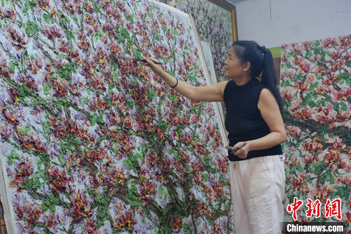 近期,广西柳州市近30万株洋紫荆竞相开放。该市的大街小巷被大片的洋紫荆包围,宛如一片“粉色海洋”。在画家林建莉的工作室内,她正站在椅子上,用画笔肆意描绘着一幅巨型的洋紫荆油画。