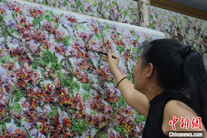 图为3月22日,广西柳州,林建莉的工作室内,她正站在椅子上,用画笔肆意描绘着一幅巨型的洋紫荆油画。 中新社记者 刘俊聪 摄