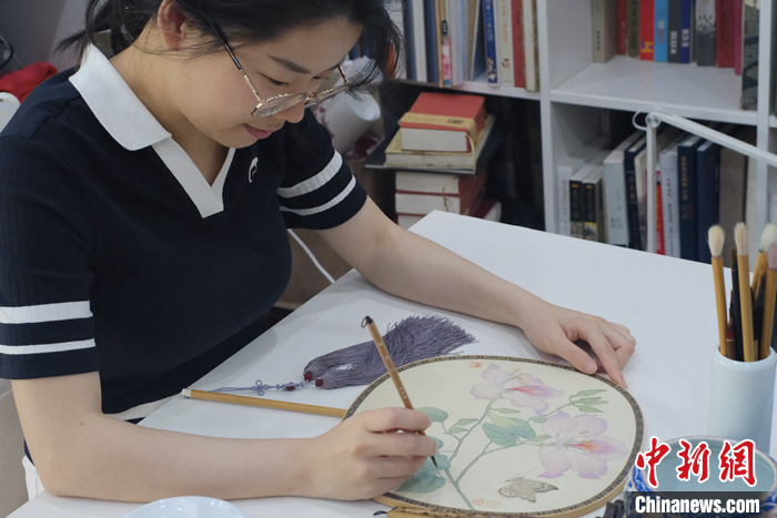 图为3月22日,广西柳州,林建莉的儿媳妇何媛将精致古典的工笔画绘制在团扇上,这些洋紫荆团扇被作为高端礼品销往美国、英国、意大利等国家。林建莉和其家人不断创新艺术形式,将柳州的洋紫荆文化推向世界。 中新社记者 刘俊聪 摄