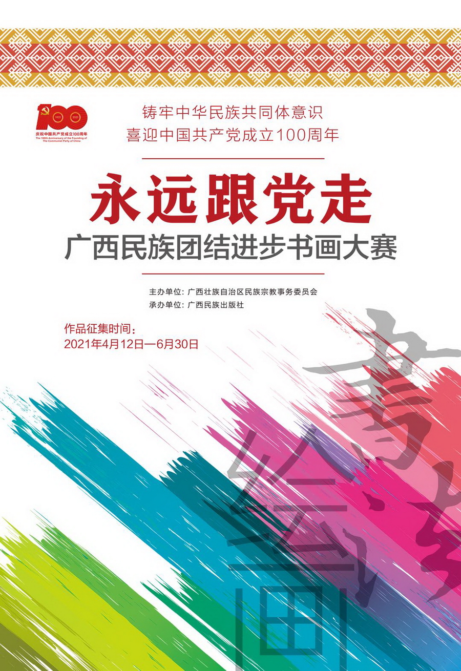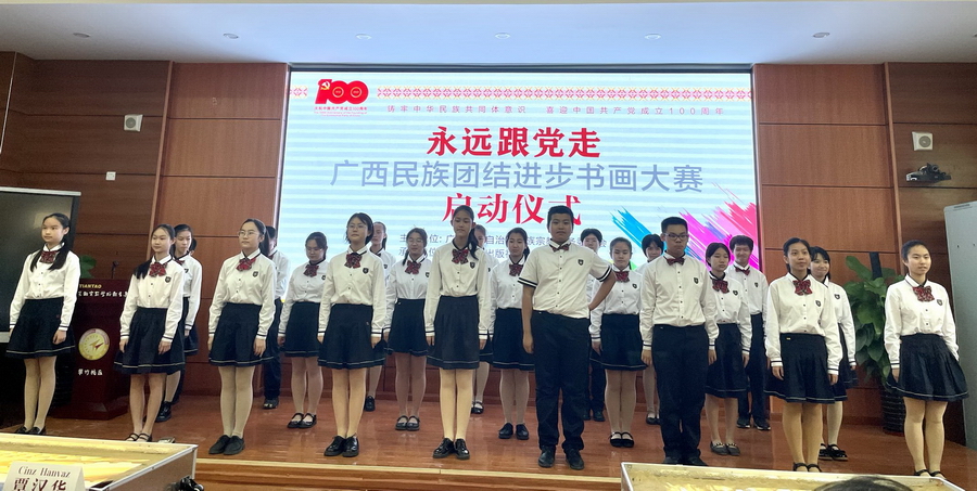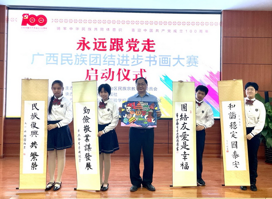 本报讯(记者 黄浩云)4月12日,“永远跟党走——广西民族团结进步书画大赛“启动仪式在南宁市天桃实验学校翠竹校区举行。此次大赛由广西壮族自治区民族宗教事务委员会主办,广西民族出版社承办。活动主题为“铸牢中华民族共同体意识,喜迎中国共产党成立100周年“。自治区民宗委党组成员、副主任翚永红,自治区民宗委二级巡视员覃汉华出席启动仪式。