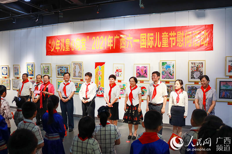 人民网南宁6月1日电 (吴明江)6月1日上午,“少年儿童心向党“2021年广西六一国际儿童节慰问活动和广西第九届“八桂画童“美术书法大赛优秀作品展在广西美术出版社美术馆举行。当天,南宁市进城务工人员子女代表和广西麟凤语语儿童发展中心、南宁市兴宁区春暖特殊培训学校儿童代表共同参加活动,喜迎第71个“六一“国际儿童节。