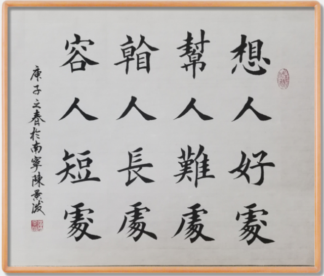 值得赞誉的是,结缘并师从田英章老师后,陈景泼在“十年磨一剑“的坚持用功练习,笔耕不辍之下,如今已在“田楷“的基础上,初步具有了个人楷书风格,无愧于八桂楷书名家之称。
