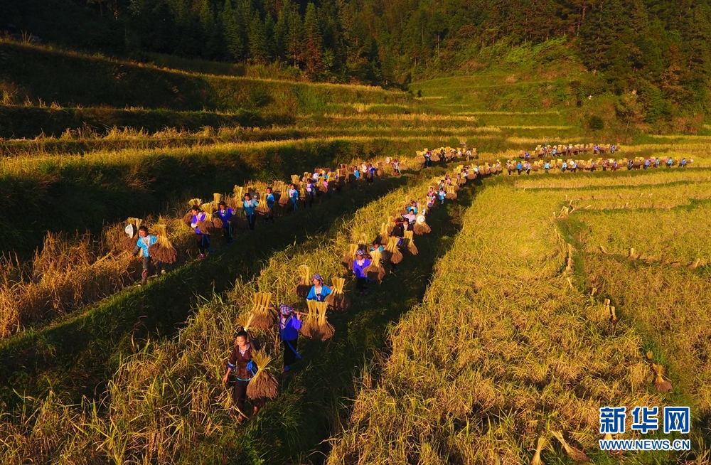 在广西融水苗族自治县安太乡元宝村,村民挑着香糯走在田间(2018年10月30日摄)。 新华社记者 黄孝邦 摄