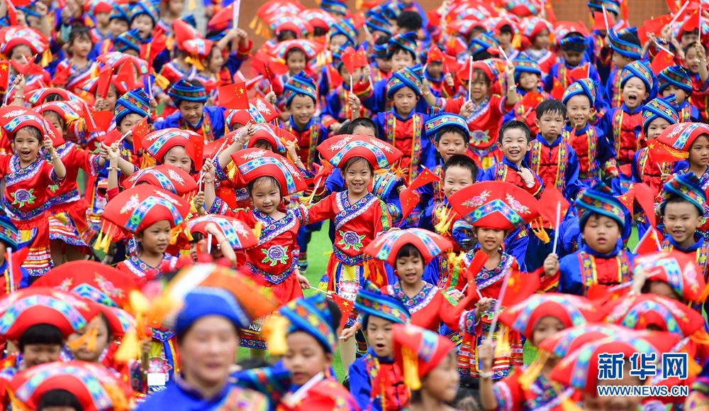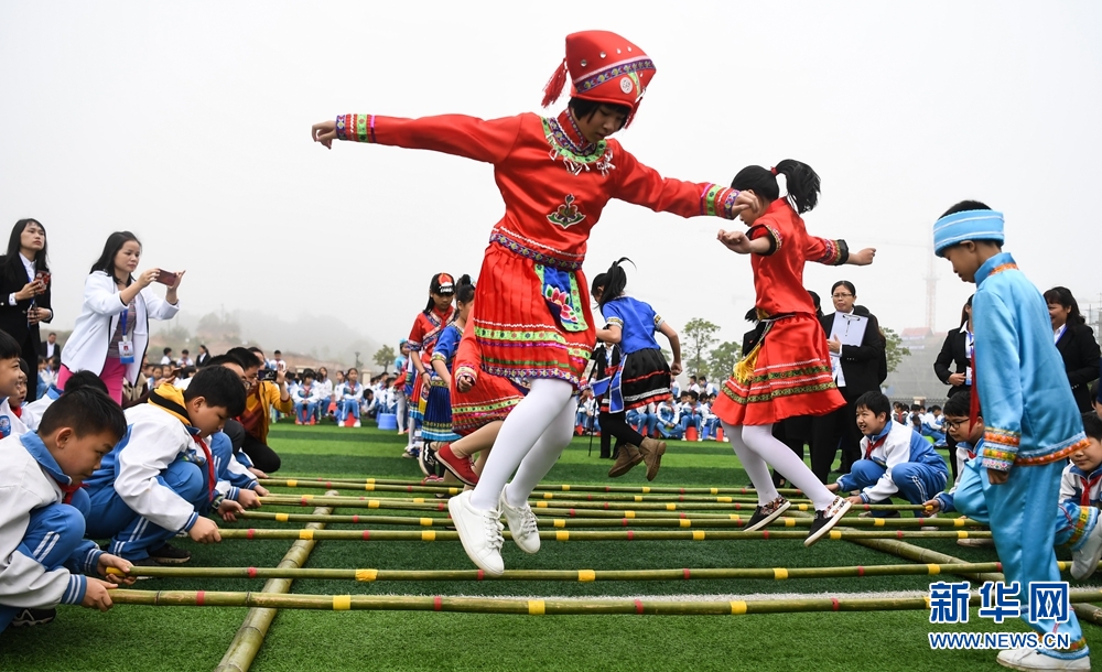 这是广西钦州市三十八小学的学生们在欢庆“壮族三月三“传统佳节(2019年4月2日摄)。新华社记者 张爱林 摄