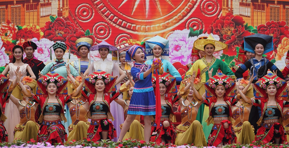 在“壮族三月三·八桂嘉年华“主会场,演员在表演民族歌舞(2021年4月14日摄)。新华社记者 杨驰 摄