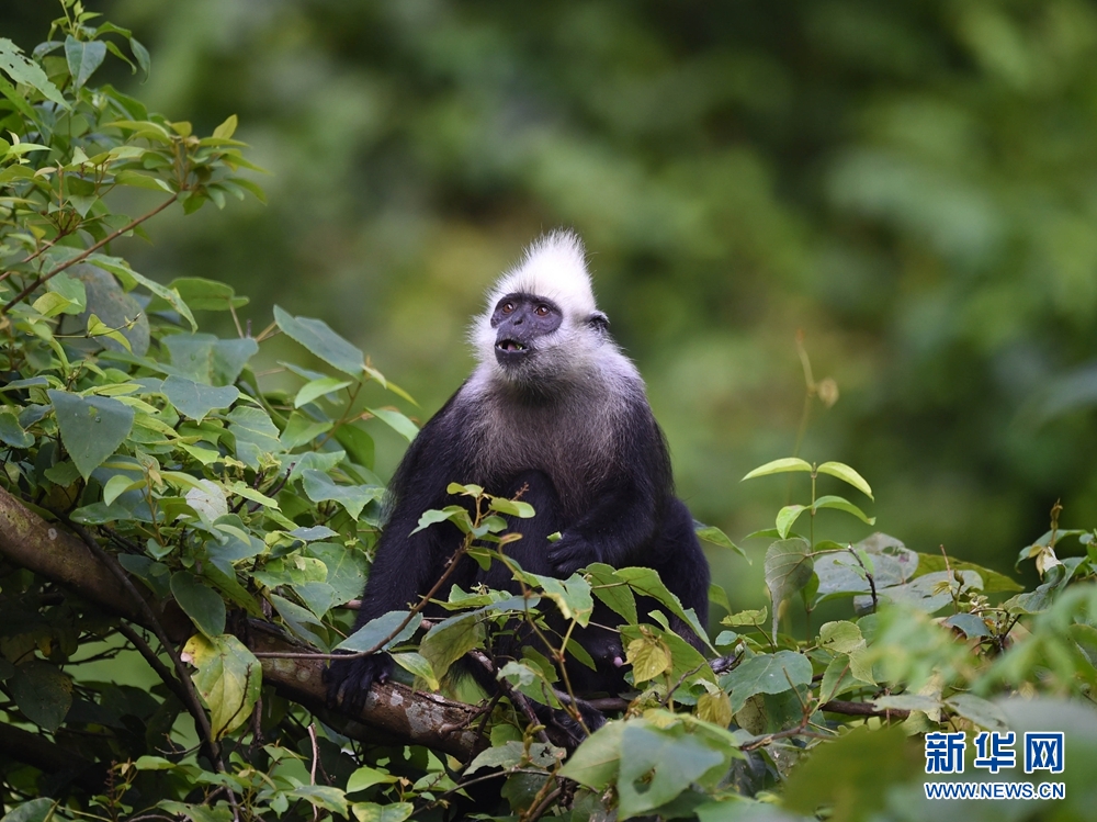 在广西崇左白头叶猴国家级自然保护区板利片区一处山坳里,在族群觅食的时候,猴王警惕地观察周围环境(2016年8月6日摄)。新华社记者 周华 摄