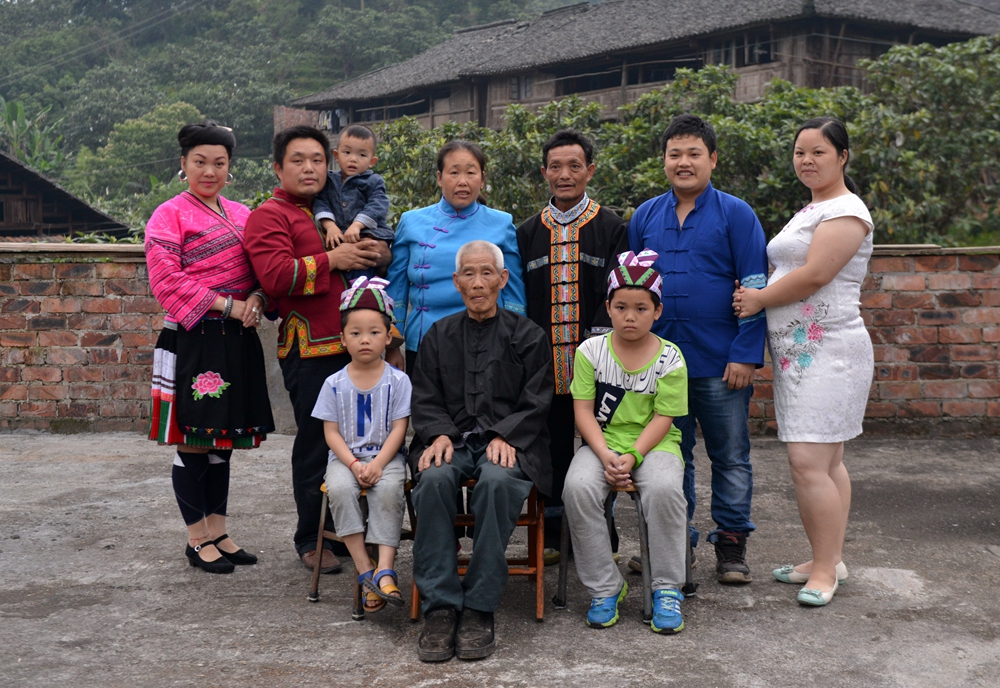 在广西龙胜各族自治县泗水乡里八滩村排壮寨,侯光祖(左二)多个民族大家庭一起合影。侯正荣(前排中)为壮族,潘艳梅(后排左一)为瑶族,侯光祖(后排左二)为侗族,侯日孟(后排左三)为苗族,王成建(后排右三)为侗族,侯光源(后排右二)为壮族,黄世红(后排右一)为汉族(2016年5月18日摄)。新华社发(潘志祥摄)