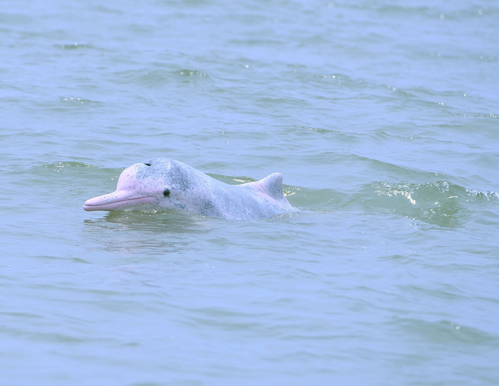 广西钦州市三娘湾海域,一头野生中华白海豚在自由嬉戏(2018年6月10日摄)。新华社记者 周华 摄