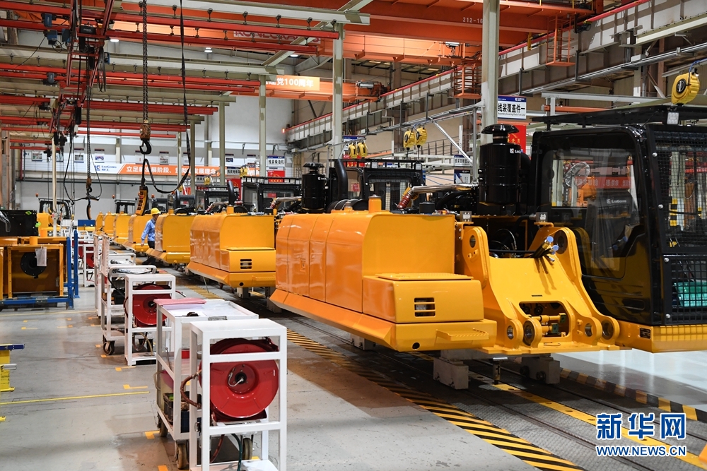 这是广西柳工集团有限公司生产厂房内正在组装的机械(2021年4月26日摄)。 新华社记者 曹祎铭 摄