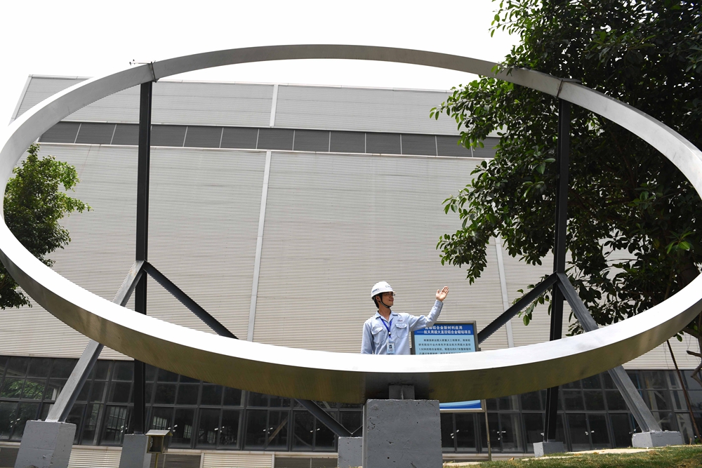 南南铝加工有限公司研发中心航空航天铝合金材料研究所所长何克准在介绍航天用超大直径铝合金锻坯项目(2017年4月20日摄)。新华社记者 周华 摄