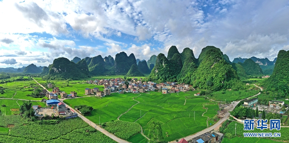 这是广西环江毛南族自治县大才乡重楼村夏日田园景色(2020年5月25日摄,无人机全景照片)。新华社记者 周华 摄