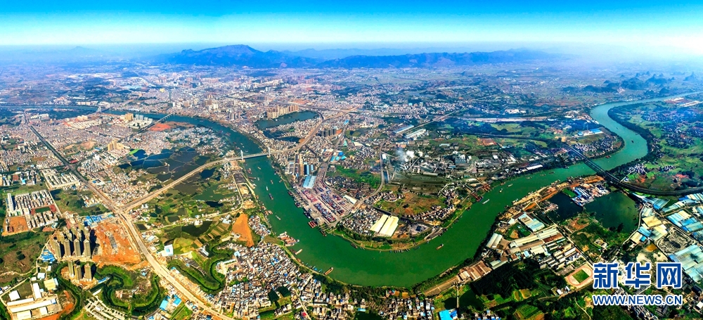 这是西江黄金水道重镇贵港市全景(2018年3月9日摄,无人机照片)。新华社记者 周华 摄
