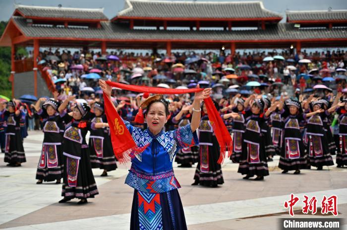 6月21日,中国唯一的毛南族自治县——广西河池市环江毛南族自治县举办传统民族节日“分龙节”。游人欢聚一堂,体验中国毛南族独具特色的民俗文化盛宴。图为民俗表演。中新社记者 俞靖 摄