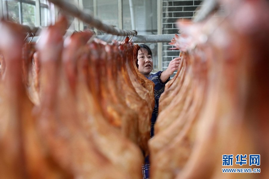 三江侗族自治县丹洲镇丹洲村村民在制作腊味。