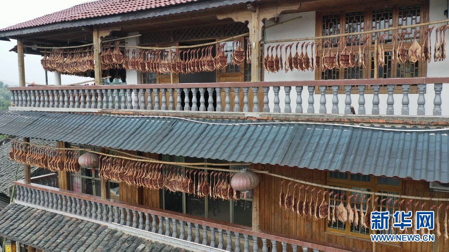 在三江侗族自治县丹洲镇丹洲村,村民在自家阳台上挂满腊鸭。
