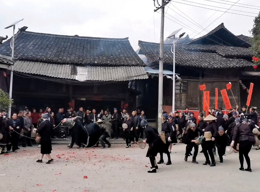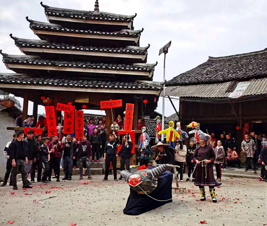 2月15日,当地侗族群众在龙胜各族自治县乐江镇地灵村开展“闹春牛“活动喜过新春佳节。