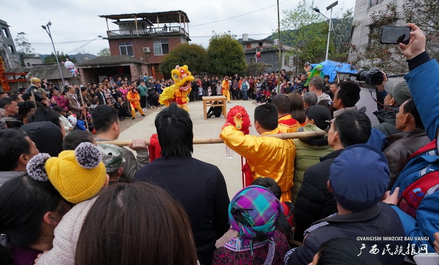 2月27日,在融水苗族自治县香粉乡古龙坡,少数民族群众在观看舞狮表演。