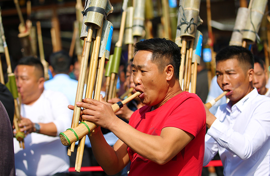 人民网融水11月29日电 近日,广西融水苗族自治县双龙沟梦呜苗寨举行第二届“芦笙狂欢节“,来自周边村寨的苗、瑶、侗等少数民族芦笙队展开芦笙比响活动。据了解,芦笙比响就是比声音大小,声音大者即为胜方。场外裁判远在1公里外的高山上听声音,并用旗语将比赛结果通知参赛者和场内裁判。