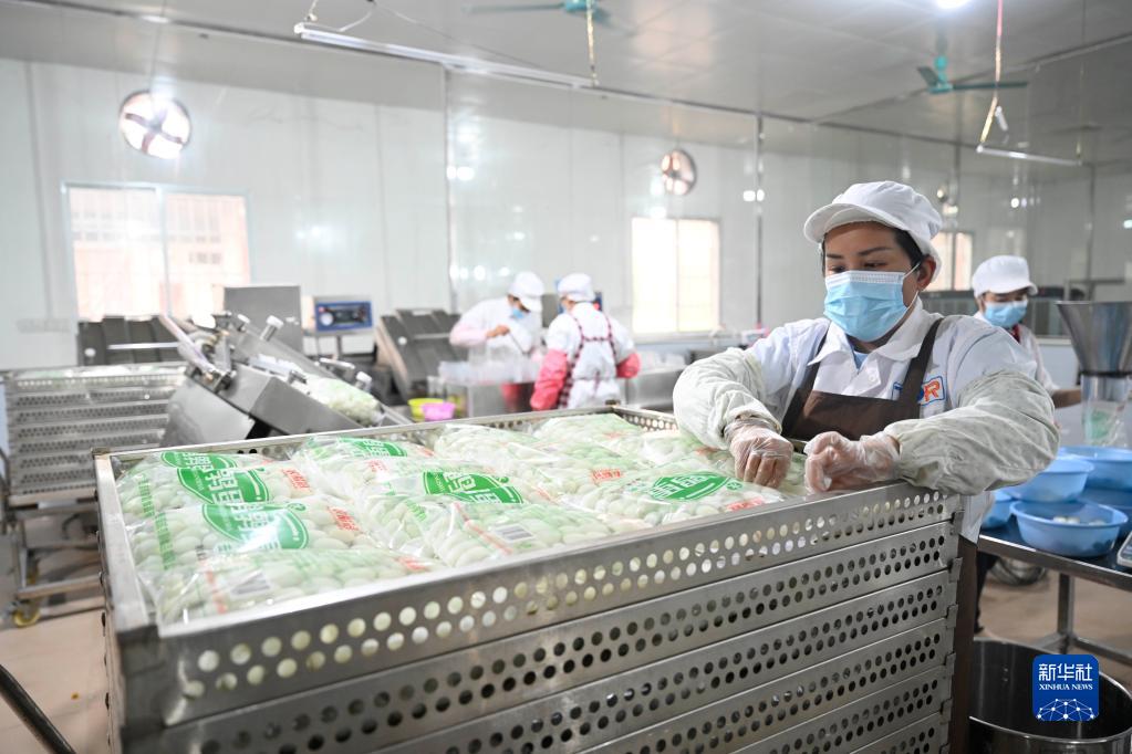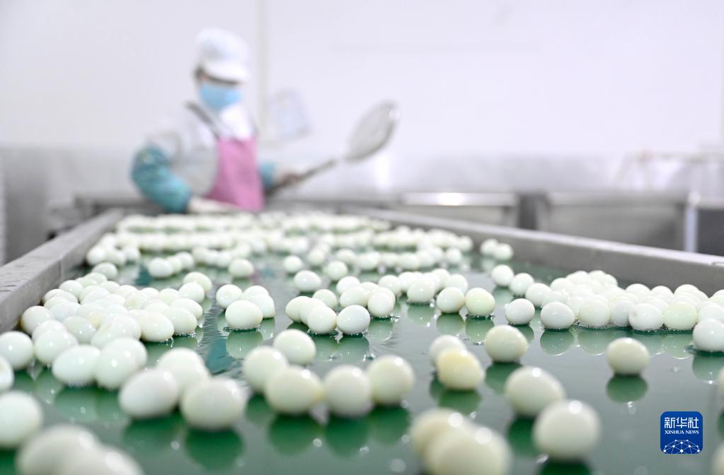 3月27日,在柳州市柳城县社冲乡柳州螺蛳粉原材料基地里,工人在鹌鹑蛋加工厂车间里忙碌。
