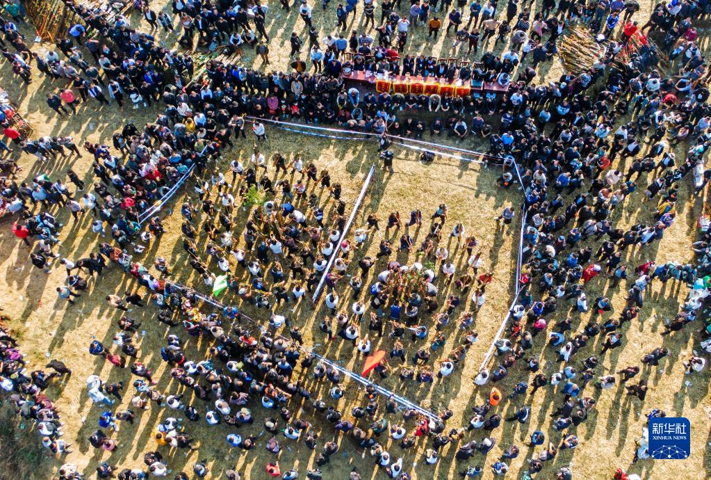 1月9日,在融水县良寨乡,人们观赏芦笙比响活动(无人机照片)。