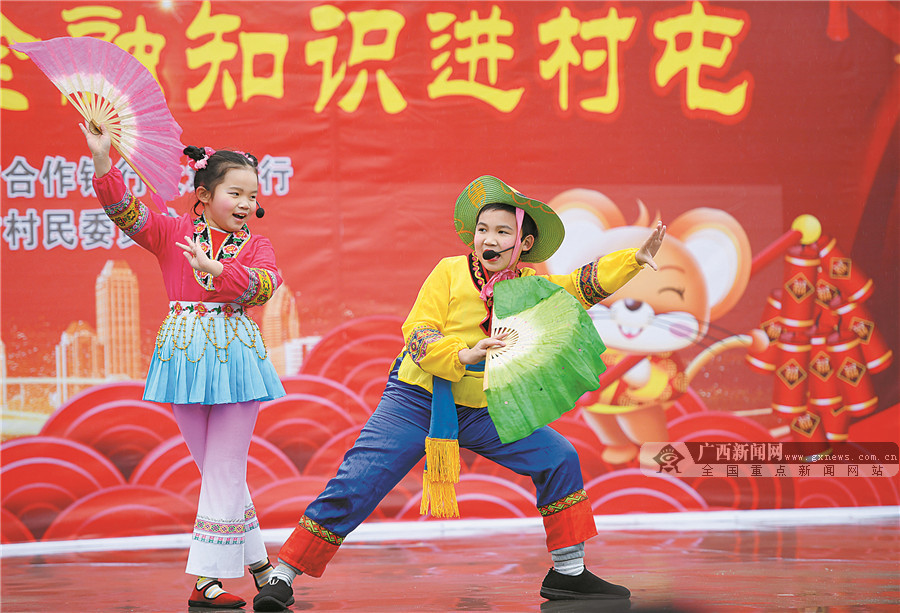 今年69岁的周锡生和67岁的爱人何秋萍都是靖西村人,从小喜欢彩调。2010年,周锡生以广西彩调剧团职业编剧的身份回乡开展彩调现状普查,发现活跃在舞台上的彩调演员都是老年人,找不到一个年轻人的身影。当年,他和爱人决定在家乡创办老还童彩调剧团,出资近14万元采购服装道具和音响设备,开设少儿彩调培训班,每逢寒暑假和周末免费教小学生学习彩调。如今,该剧团已累计招收70多名4—12岁的少儿彩调演员,曾多次受邀到广西、上海等地表演。2019年,老还童彩调剧团被评为柳城县新时代文明实践中心未成年人彩调非遗文化传承基地。