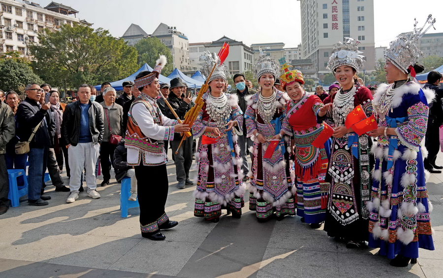 在柳州市融水苗族自治县民族广场,苗族歌手在苗歌宣传法治。