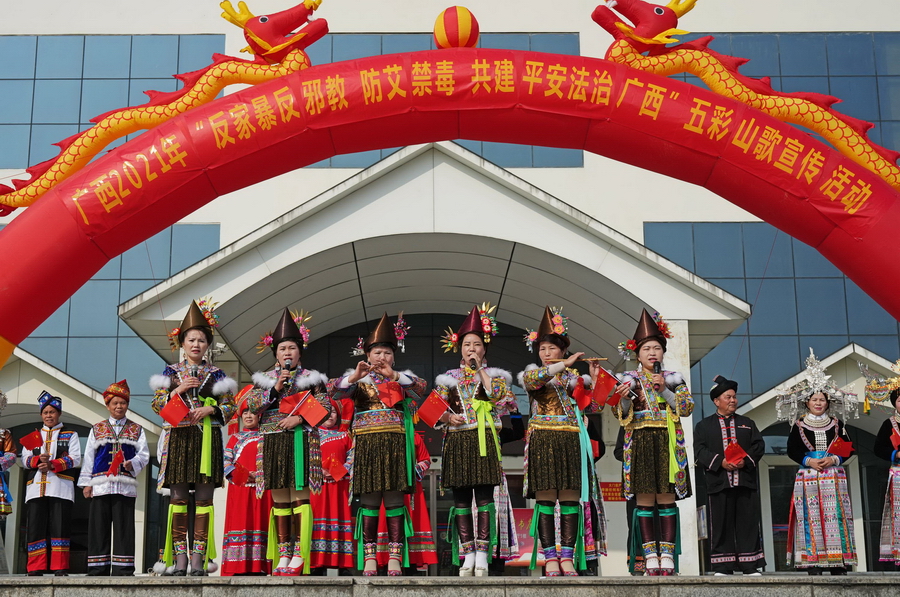 当日,广西自治区妇联在融水苗族自治县开展2021年“反家暴反邪教 防艾禁毒 共建平安法治广西“五彩山歌宣传活动,组织苗、瑶、侗、土拐和桂柳5种山歌的歌手,就反家暴反邪教等进行法治宣传。(龙 涛 摄影报道)