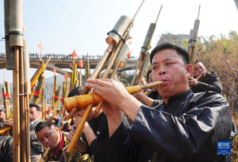 1月9日,在融水县良寨乡,村民吹奏芦笙为踩堂伴奏。1月9日,在融水县良寨乡,人们观赏芦笙比响活动(无人机照片)。1月9日,在融水县良寨乡,两支芦笙队参加芦笙比响活动。1月9日,在融水县良寨乡,人们带着芦笙前往节日活动地点。1月9日,在融水县良寨乡,村民在吹奏芦笙。 当日,广西融水苗族自...