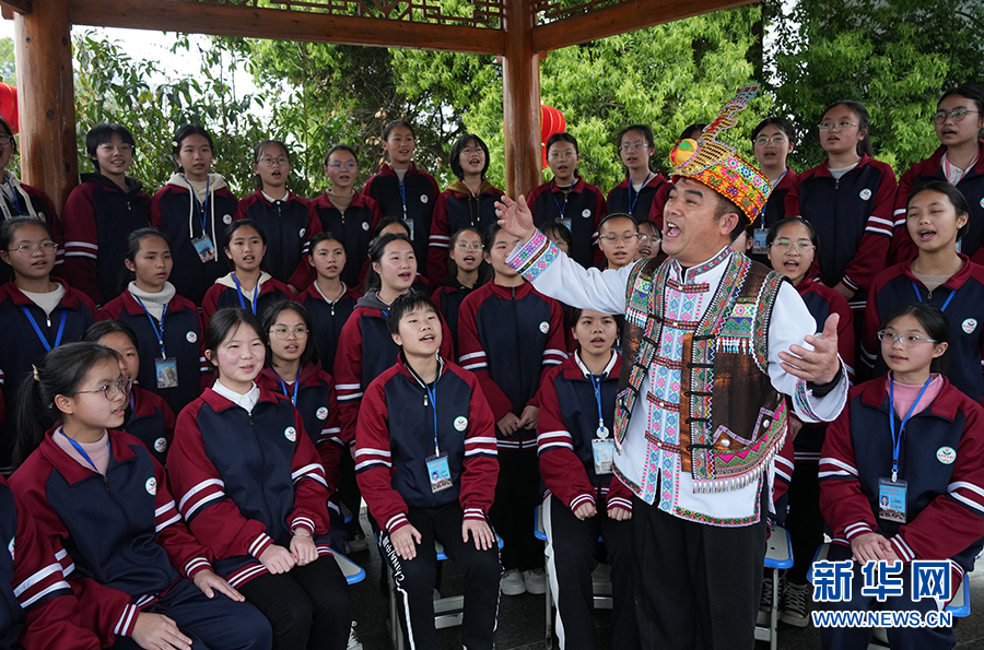 在广西柳州融水苗族自治县民族中学,广西“山歌王”杨仕余在教唱融水山歌。新华网发 龙涛 摄