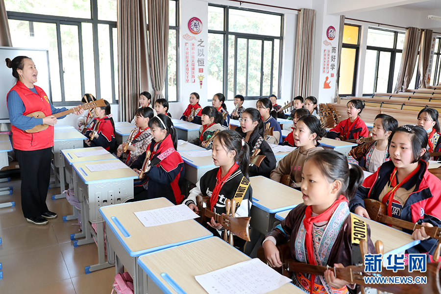在广西柳州三江侗族自治县古宜镇江川小学,同学们在学习侗族琵琶歌。新华网发 龚普康 摄