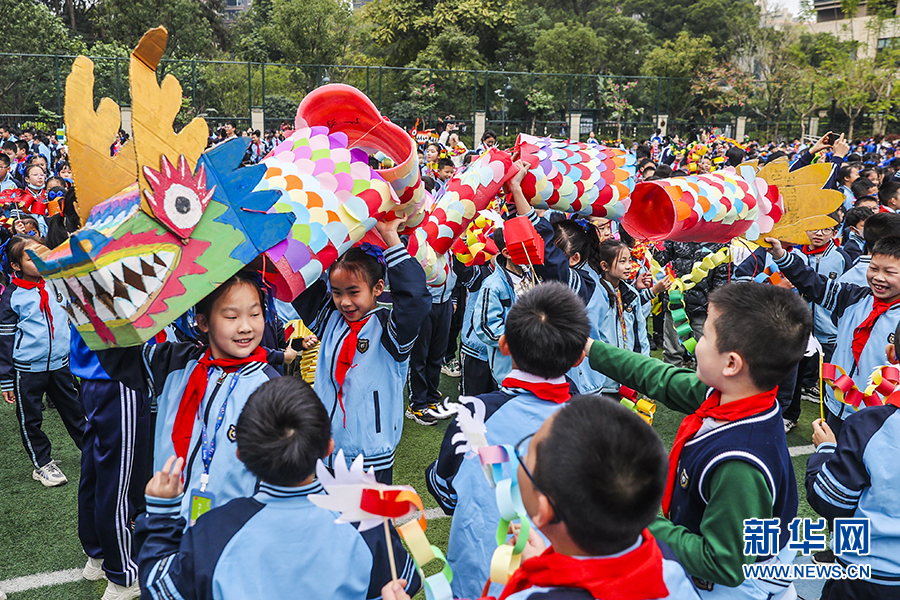 在广西南宁市滨湖路小学长虹校区,同学们开展壮娃舞龙活动。新华网发 刘峥摄