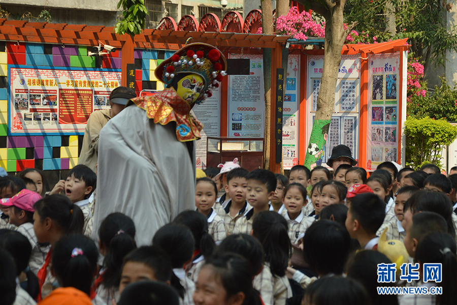 在广西南宁市长堽路小学开展的“戏曲进校园”主题活动。新华网发